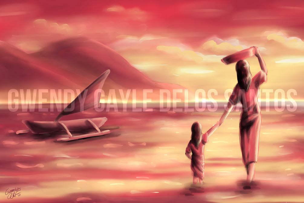 Translates to "Mother and Child by the Seashore". A digital remake of an old poster painting I did 10 years ago. Limited use of colors. Inspired from my mother's childhood days growing up by the sea. 12 x 18 inches at 300DPI JPEG only.